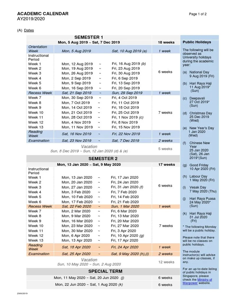Web the standard academic calendar*, with effect from ay2020/21, will have the following structure: Semester 2 commences on the second. It consists of two semesters and a special term. The national university of singapore's academic year starts from august and ends in july of the following year.